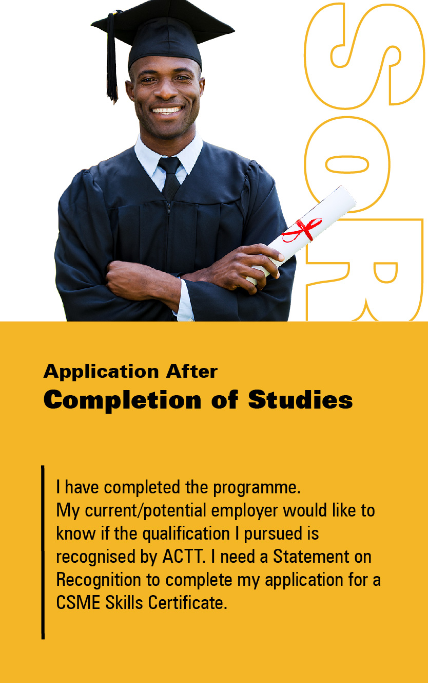 ACTT provides authoritative advice and guidance on the recognition of foreign and local tertiary level institutions and qualifications. Members of the public and all other stakeholders are invited to submit requests for a Statement on Recognition which provides details on the accreditation and/or recognition status of any post secondary and tertiary level institution or qualification, from any part of the world. A Statement on Recognition can assist you to:
